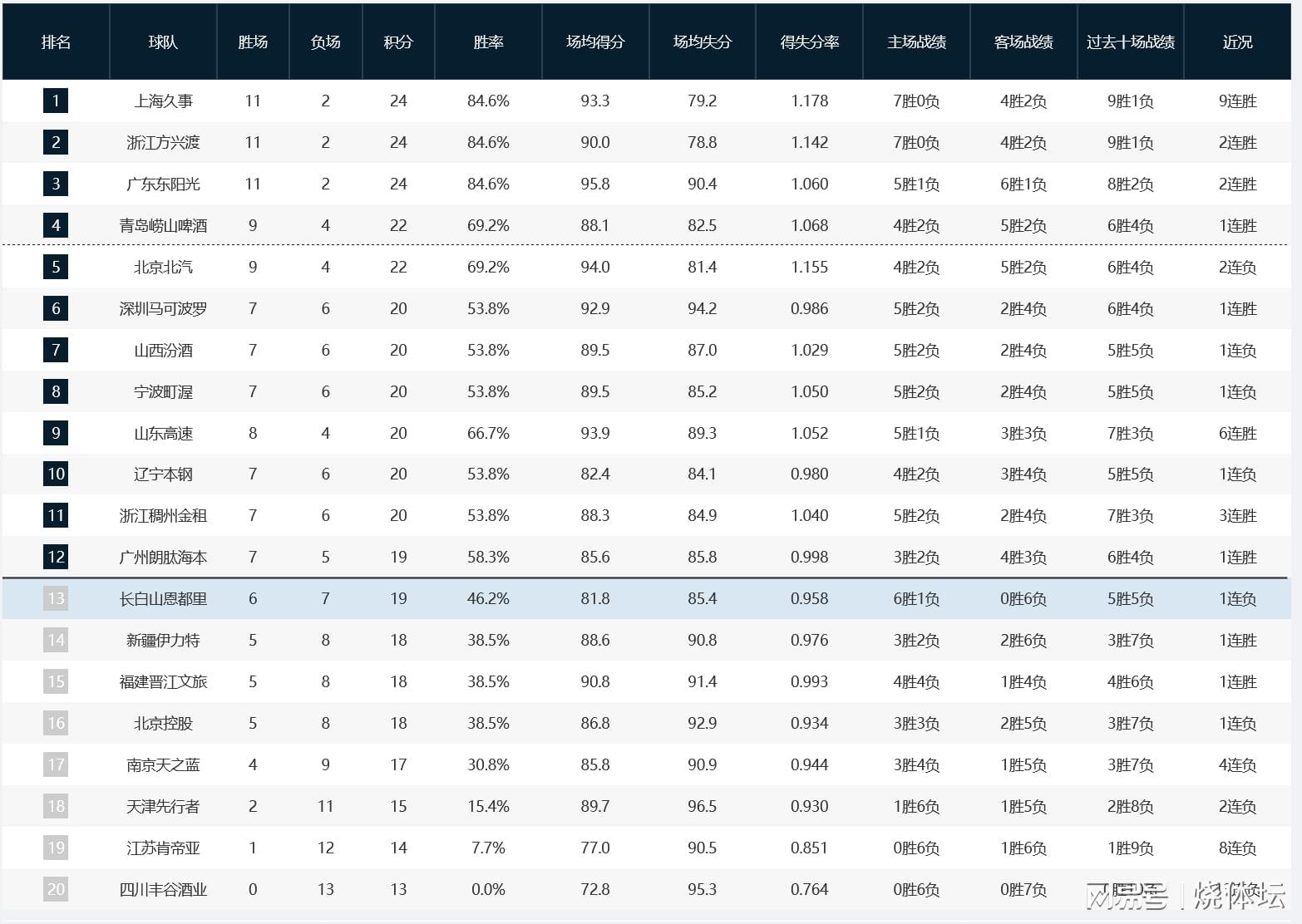 北京时间1月11日晚,2025/26赛季CBA常规赛,第13轮比赛战罢。本轮青岛、广东和广厦皆在客场带走胜利,而山东、上海、深圳和新疆各自在主场告捷。至此,上海、广厦和广东继续同分位居前三,青岛升至第四,北京下降到第五。